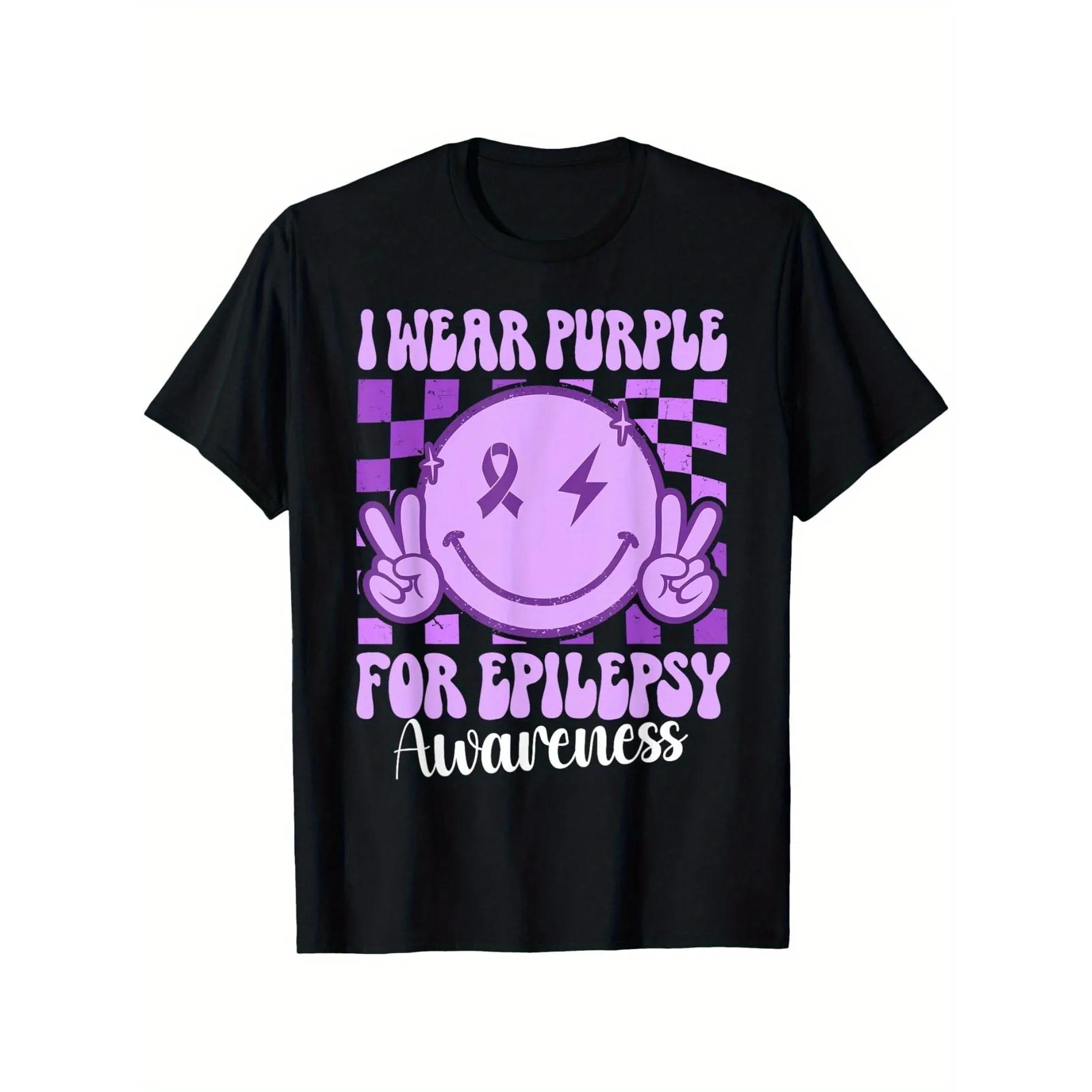 Epilepsy Awareness T-Shirt for Men Wear Purple Graphic Tee with joyful Face Bolt Design 100% Cotton Relaxed Fit Casual Shirt.