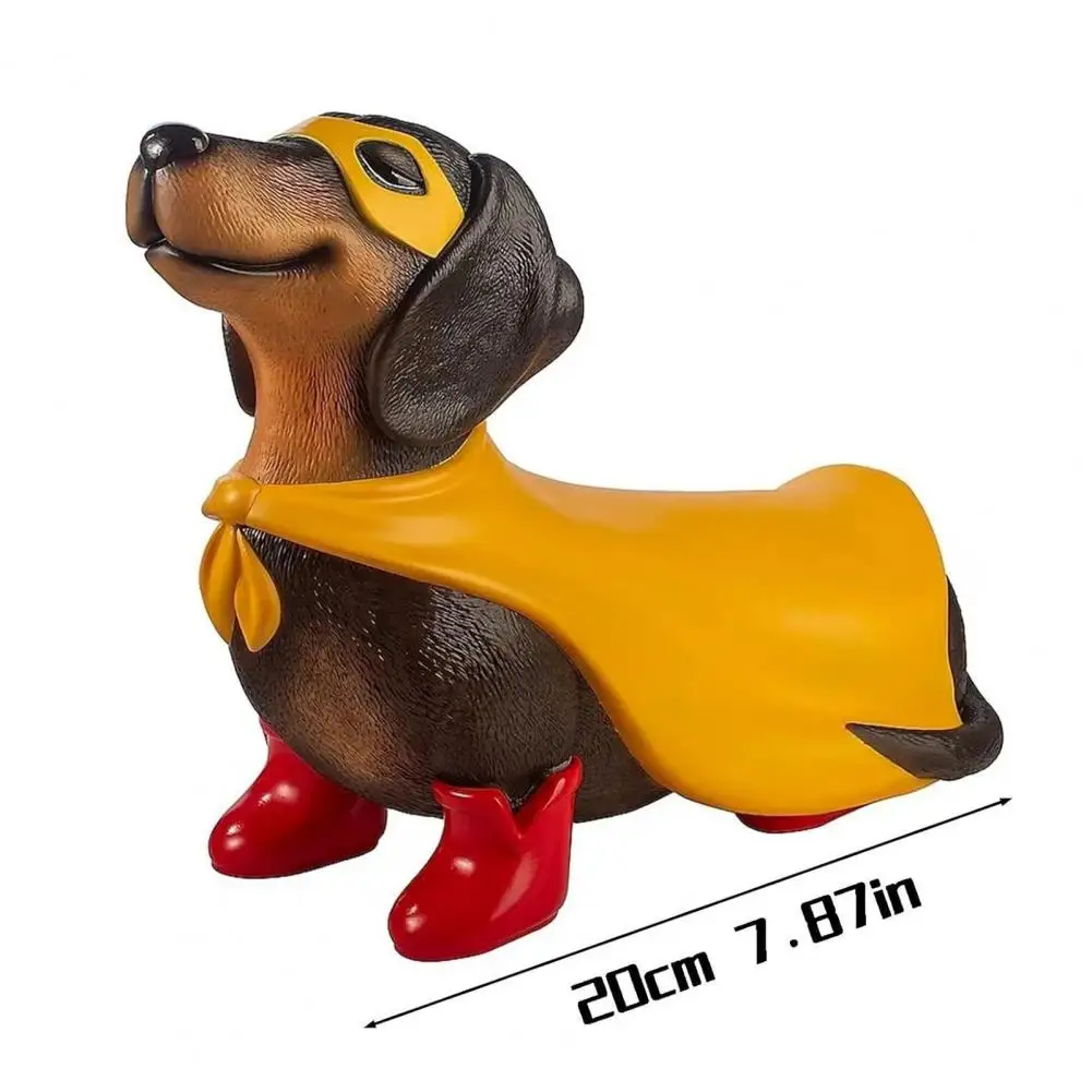 Cute Dachshund Design: Embrace whimsical charm with the adorable hero-themed dachshund statue featuring a delightful yellow cloak, eye cover, and red boots. Infuse your space with a touch of playfulness and character that sparks joy and conversation.